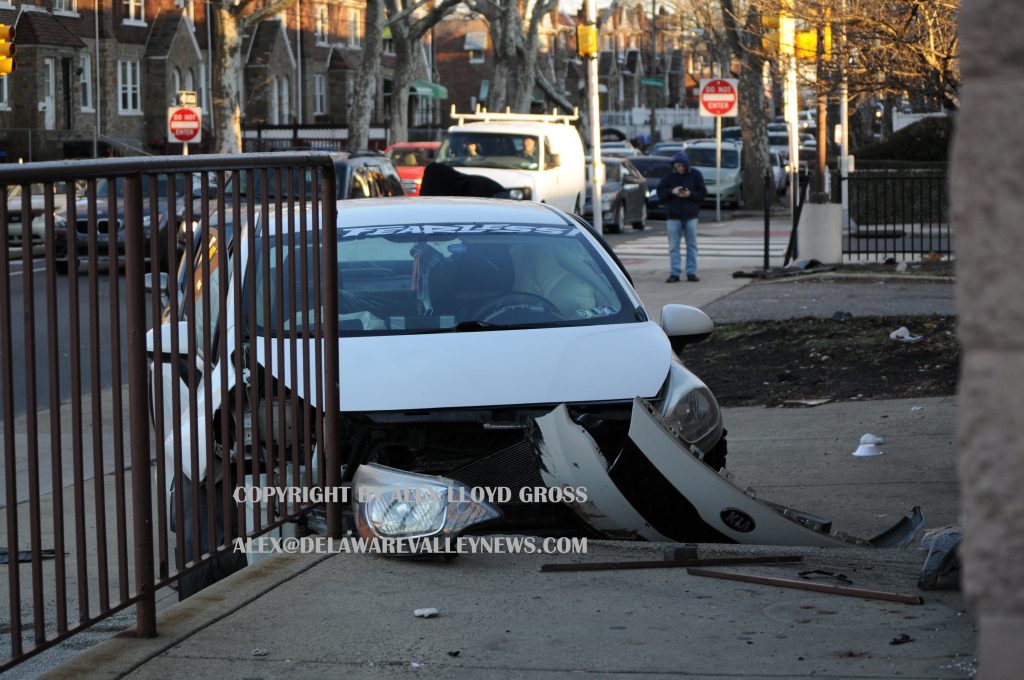 The force of the impact pushed the striking vehicle into the side steps of the drug store. No structural damage was reported. The driver of the striking vehicle got out of his car and walked away, possibly north on Frankford Avenue, leaving the driver and passenger of the other car to fend for themselves. Those people sustained minor injuries.
