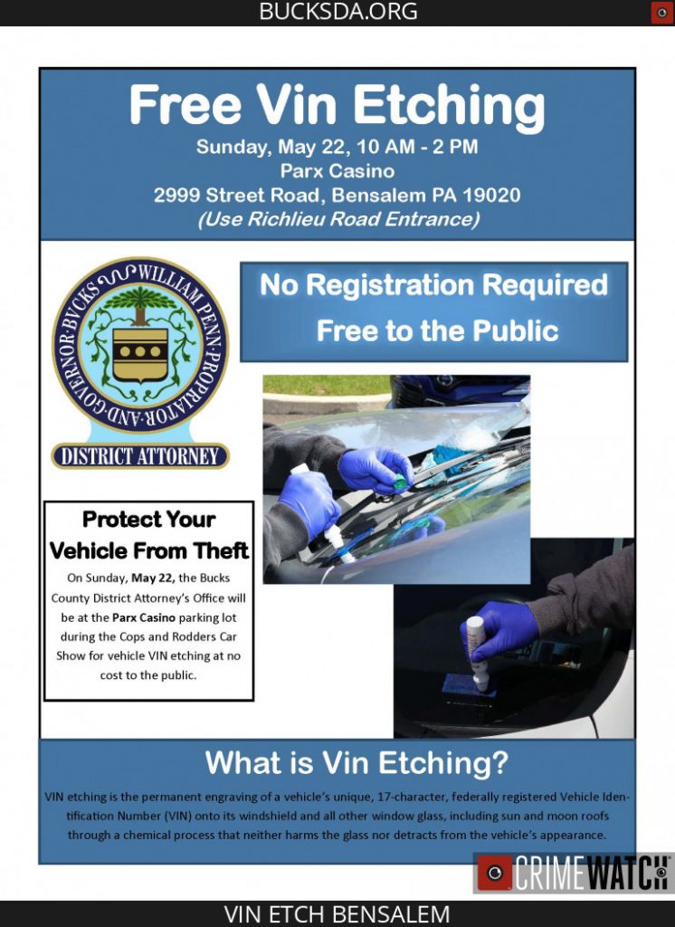The process for getting this done takes about 10 minutes and it will happen Sunday, May 22, 2022 at Parx. This is being done for free by officers from the District Attorney’s Office from Bucks County. This will start around 10;00 AM near the Richlieu Rd Entry . It runs until 2:00 PM. You should bring current registration, and insurance with you. By doing this, some insurance companies will give a discount. You should check with your company to see what you may be entitled to.