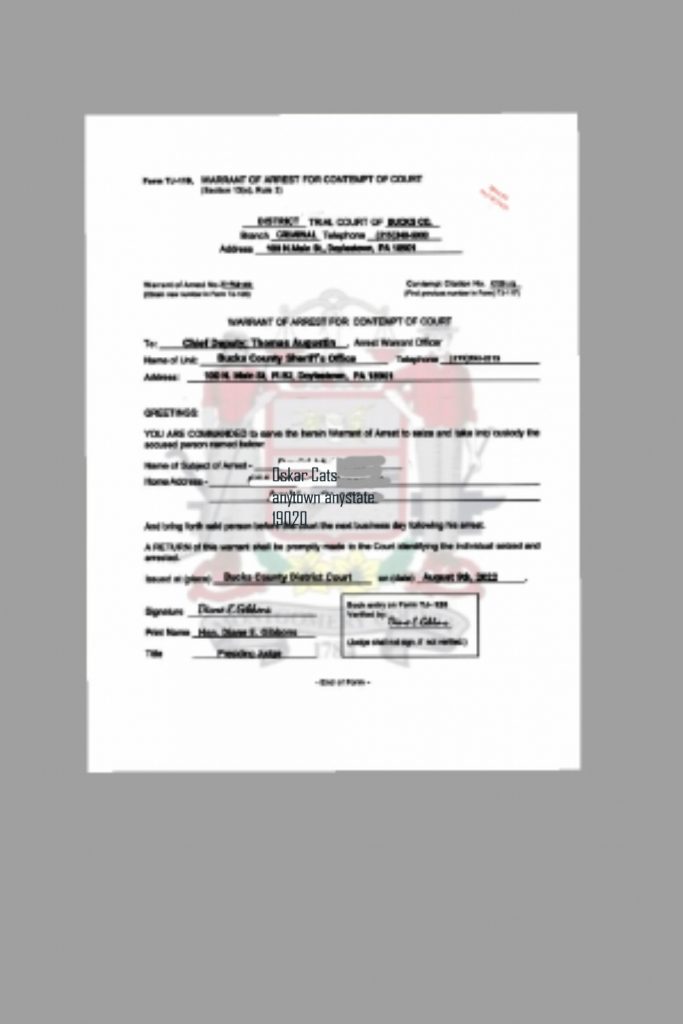 A copy of a fake warrant. The real victims name has been taken out and the authors cat’s name has been inserted in it’s place.