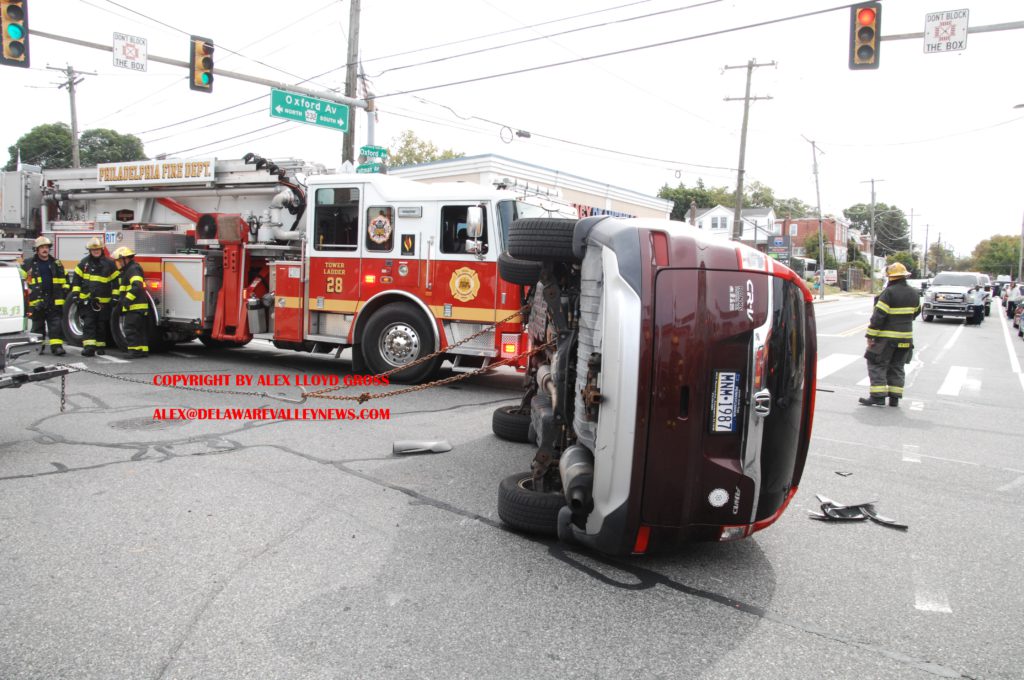 One vehicle, the one that flipped, was traveling south, when another vehicle which was on Cottman Ave. turned in front to go onto Oxford Ave. Two medic units were brought to the scene and the west bound lane of Cottman Ave was closed along with the Southbound lane at Oxford Ave.