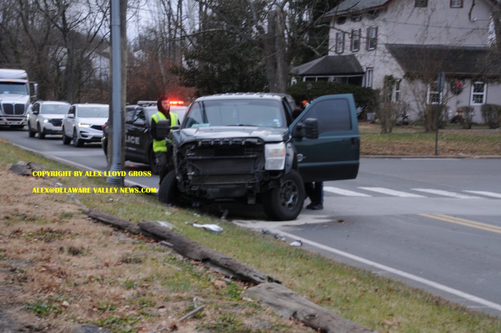 The front end of the truck sustained heavy damage, though the utility pole was not impacted structurally. Police diverted traffic around the scene while crews worked to clear the wreckage and tow the vehicle.