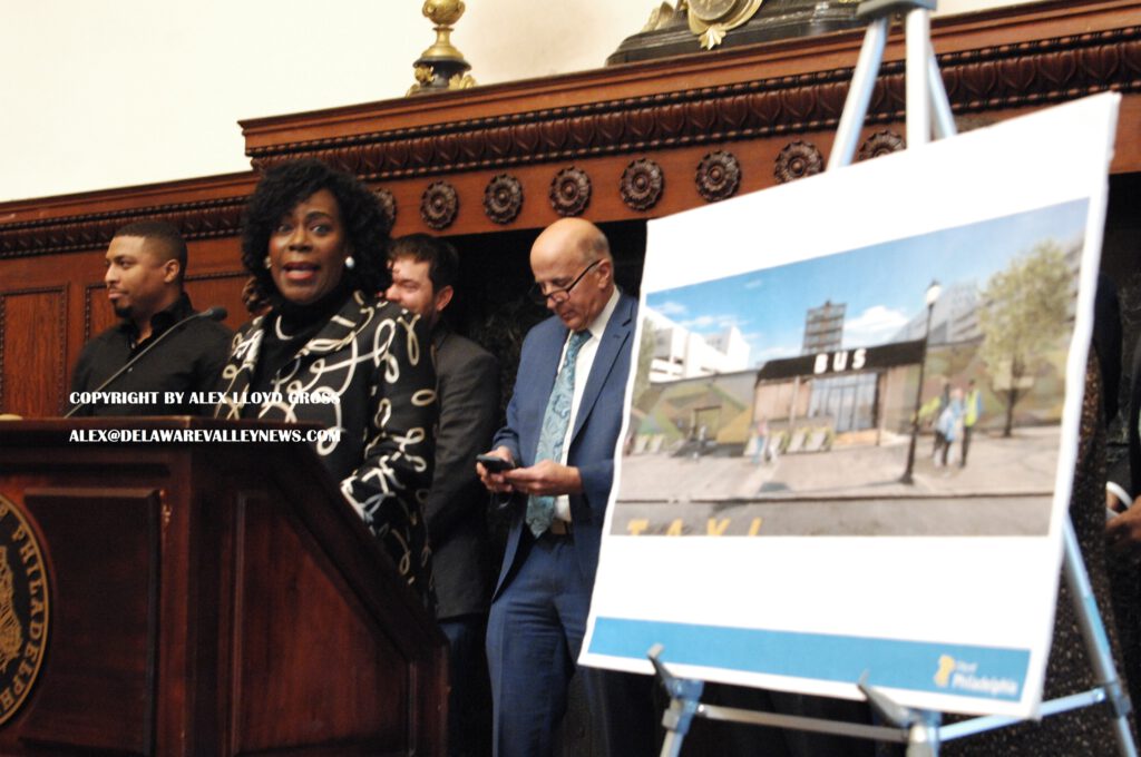 Alex Lloyd Gross Photo Delaware Valley News.com Mayor Parker with a rendering of the new terminal.