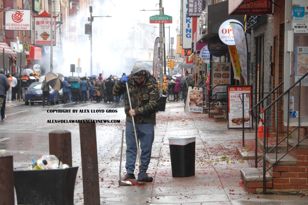 Alex Lloyd Gross Photo Delaware Valley News.com After the lions have passed, a merchant sweeps in front of his store as a crowd watches another lion team in the background.