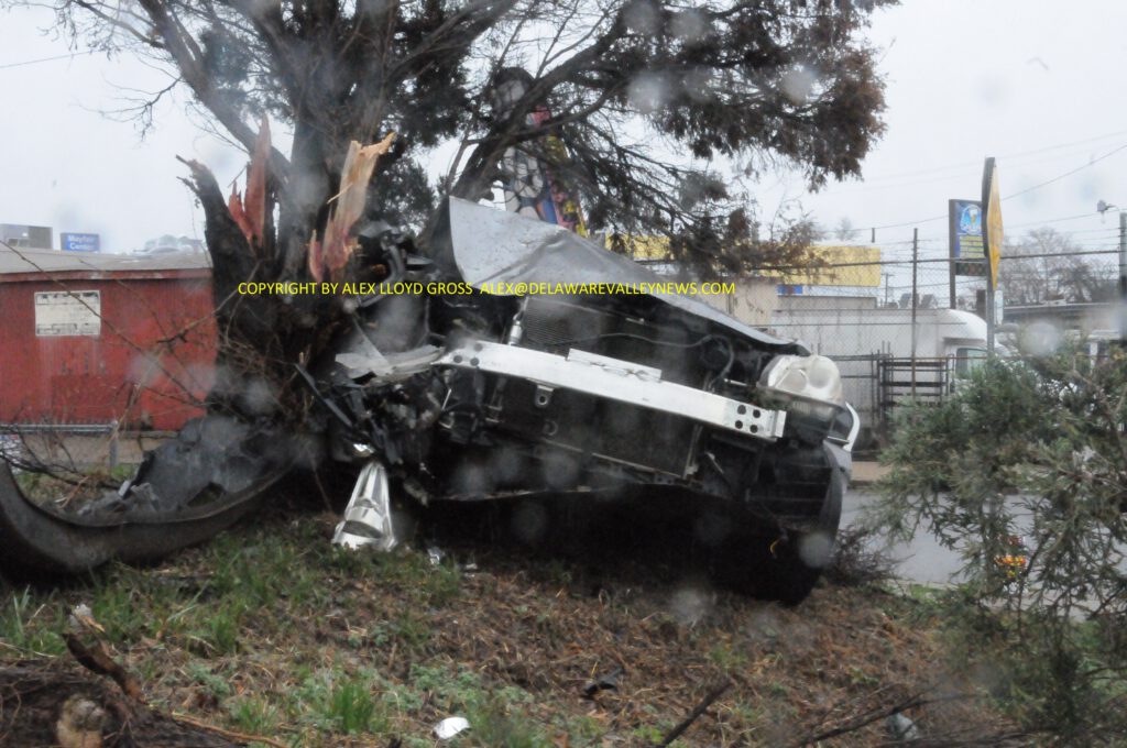 About 10:30 AM police, fire and medics were called to Sackett and Levick Streets in the Mayfair section of the city for an accident. Upon arrival, a car was resting on a hill, near a house after knocking over bushes and damaging trees on the front yard.