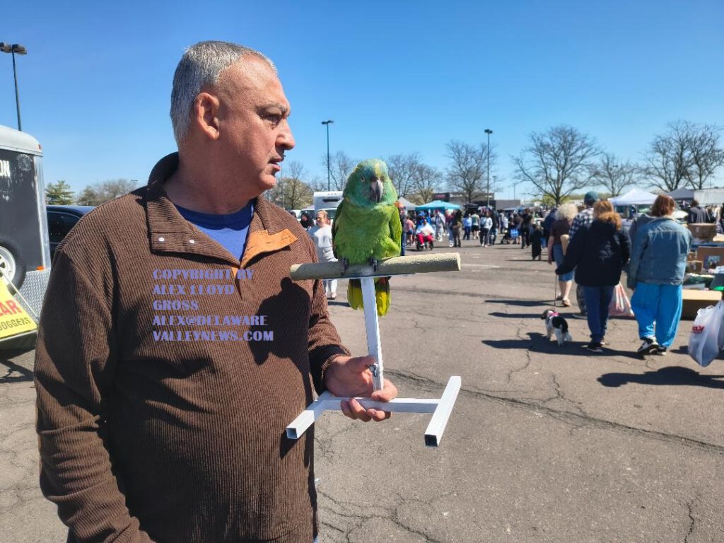 Alex Lloyd Gross Photo Delaware Valley News.com A man brings his per parrot to the flea market.
